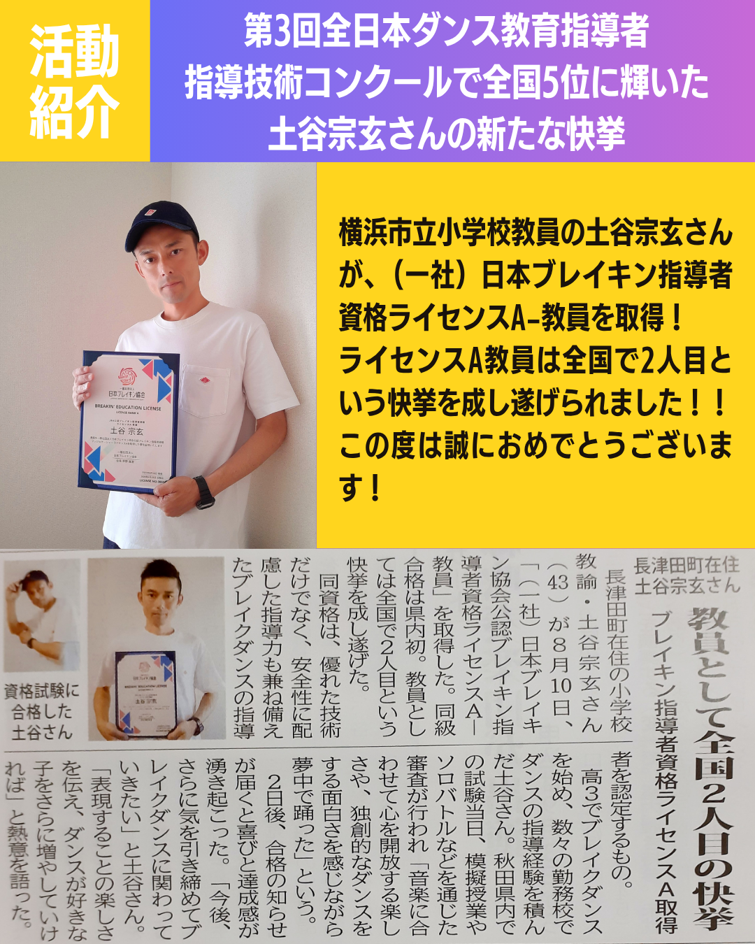 第3回全日本ダンス教育指導者 指導技術コンクール入賞者の土谷宗玄さんが(一社)日本ブレイキン指導者資格ライセンスA-教員を取得しました!